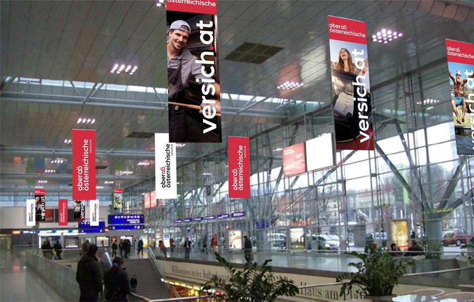 Die Kampagne der Oberösterreichischen Versicherung setzt gezielt auf die Kombination unterschiedlicher Medienkanäle. Großformatige Plakatflächen bilden dabei einen zentralen Bestandteil – allen voran ein 72-Bogen-Plakat in der Waldeggstraße, das durch seine markante Formatsprengung und kreative Gestaltung besonders auffällt und maximale Sichtbarkeit erzielt. Ergänzend sorgen LED-Walls, Citylights sowie Deckenhänger am Hauptbahnhof Linz für zusätzliche Aufmerksamkeit und eine starke Wahrnehmung im öffentlichen Raum.